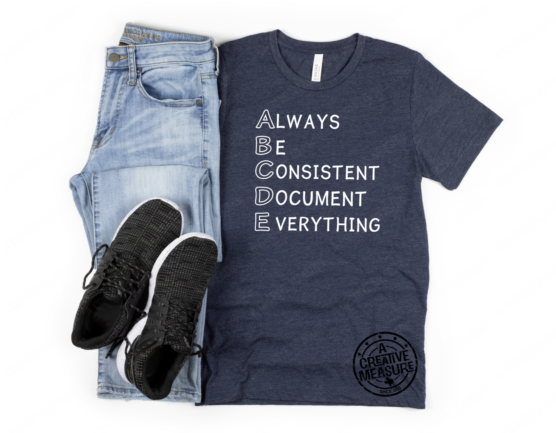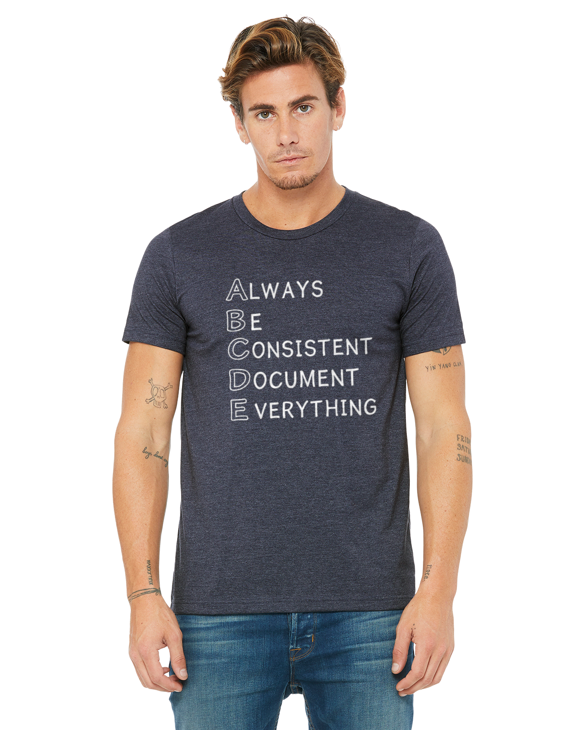 This ABC's, Always Be Consistent And Document Everything in human resources design is applied to a heather navy shirt using white vinyl. The Purposed HR website will be on the back.