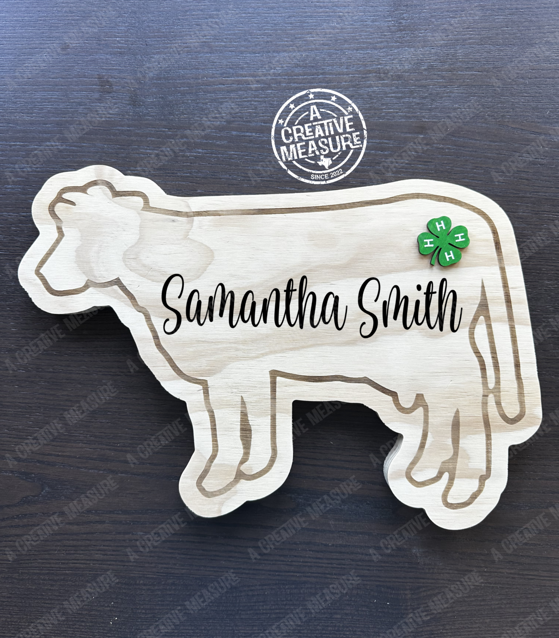 Each show cow sign is vinyled with the owners name. These custom cow signs are perfect for rodeos to display your 4H or FFA students' name. They even make the perfect sale gifts for the buyers! Please type the information EXACTLY as you would like it to appear on your sign. Your piece will come standard with the name (large font) in the middle of the sign and any text you would like.
